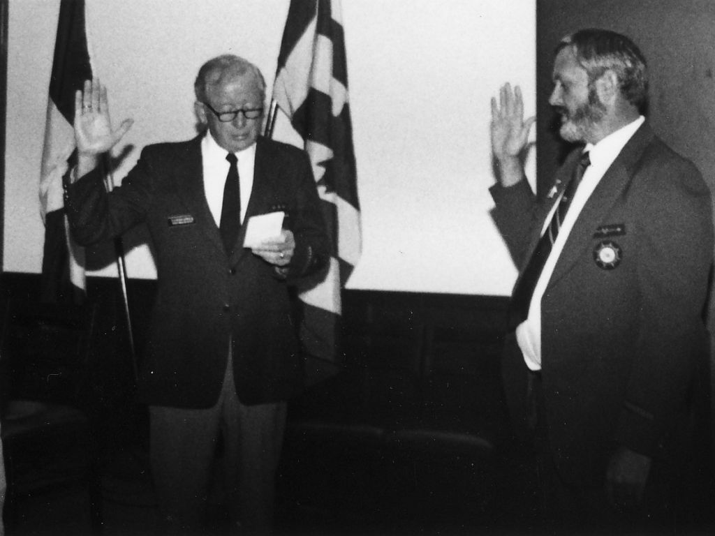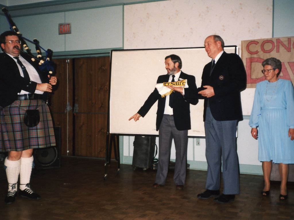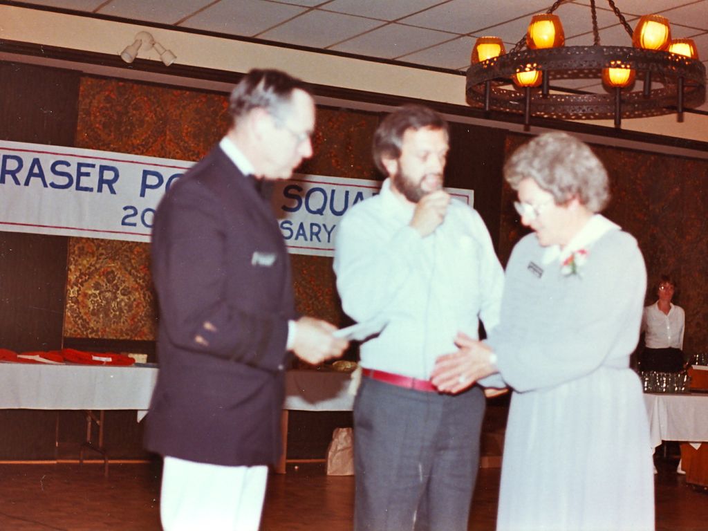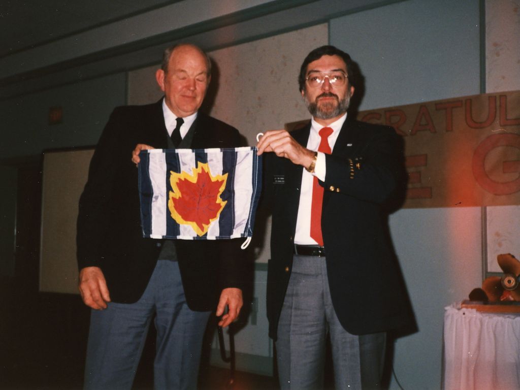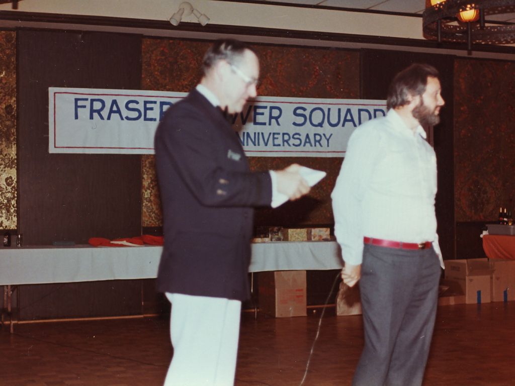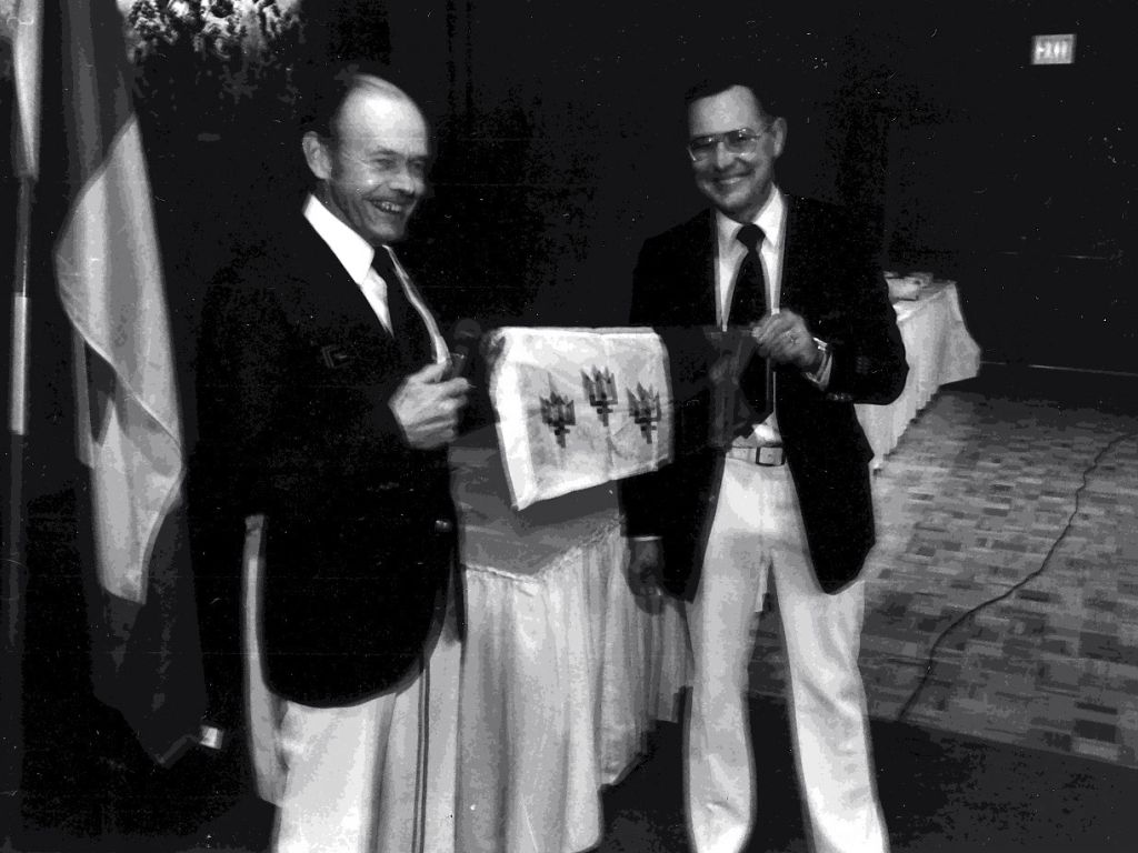 DC(R) Wally Kiss presents DC Norm Dyck with his flag. District AGM 1984. Norm is Fraser's second District Commander.