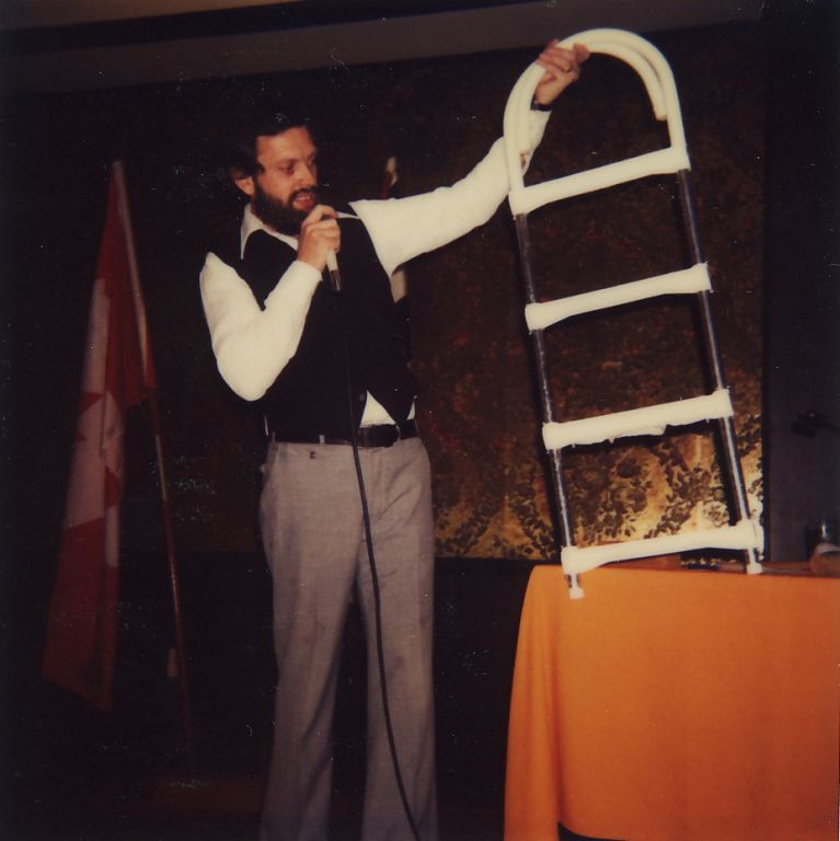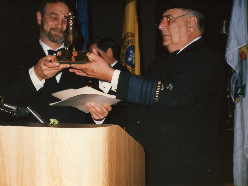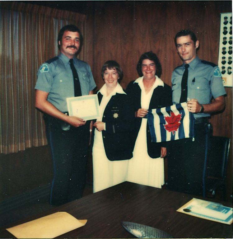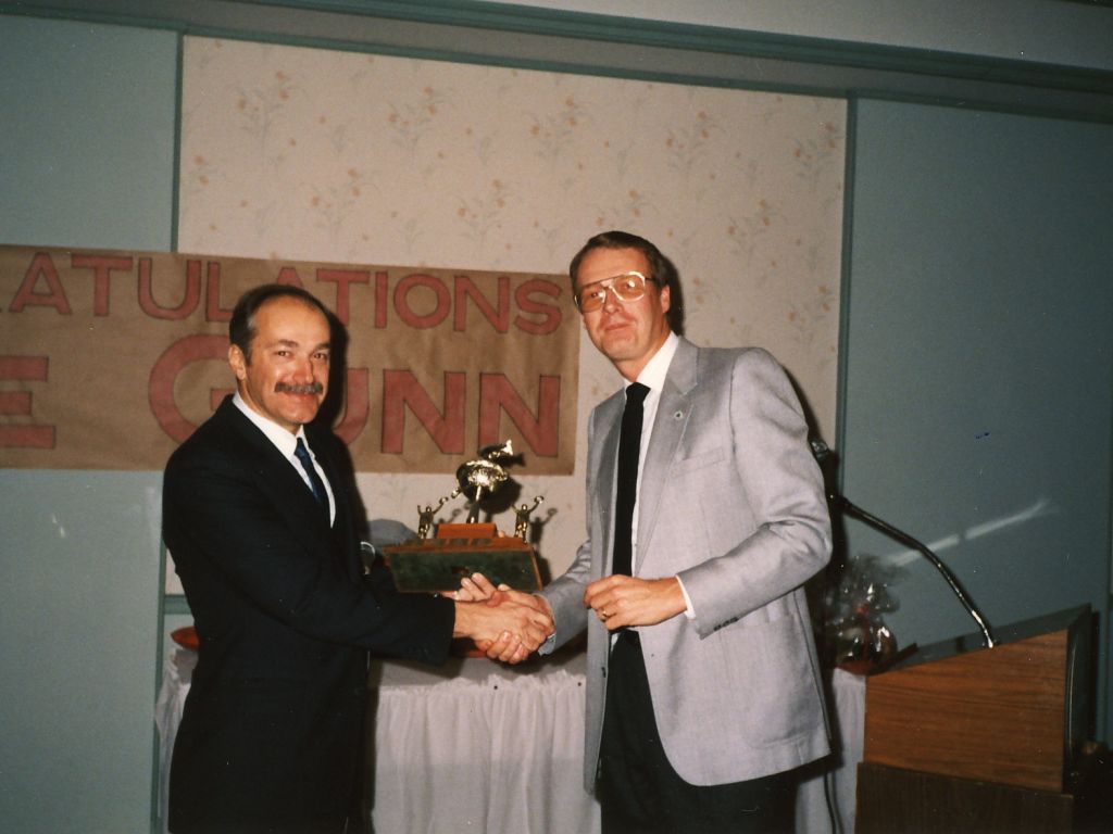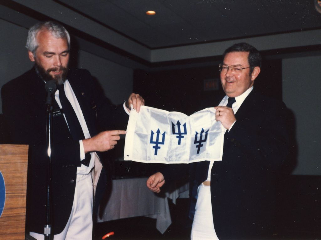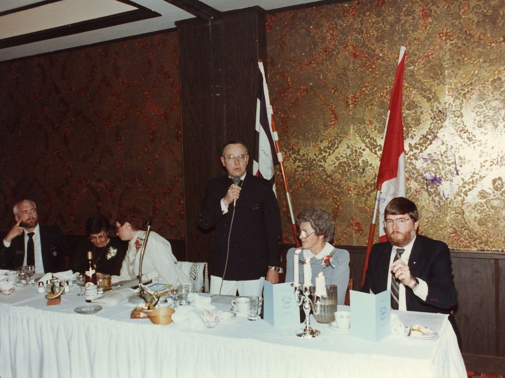 DC(R) Wally Kiss presents DC Norm Dyck with his flag. District AGM 1984. Norm is Fraser's second District Commander.